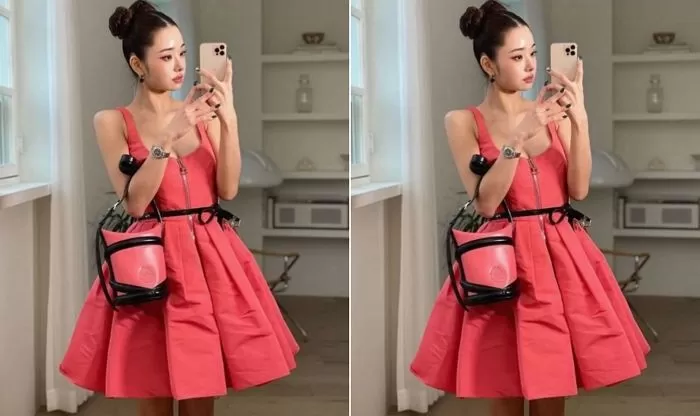 사진 속 송지아는 머리카락을 양 갈래로 땋아 올려 묶은 헤어스타일을 연출하고 비비드한 핑크 색상의 집업 미니 드레스를 착용한 모습입니다.