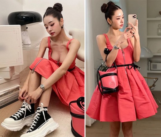 여기에 송지아는 블랙 벨트와 플랫폼 하이톱 스니커즈를 매치하고 드레스와 같은 색감의 미니백을 들어 시크하면서 관능적인 룩을 완성했습니다.
