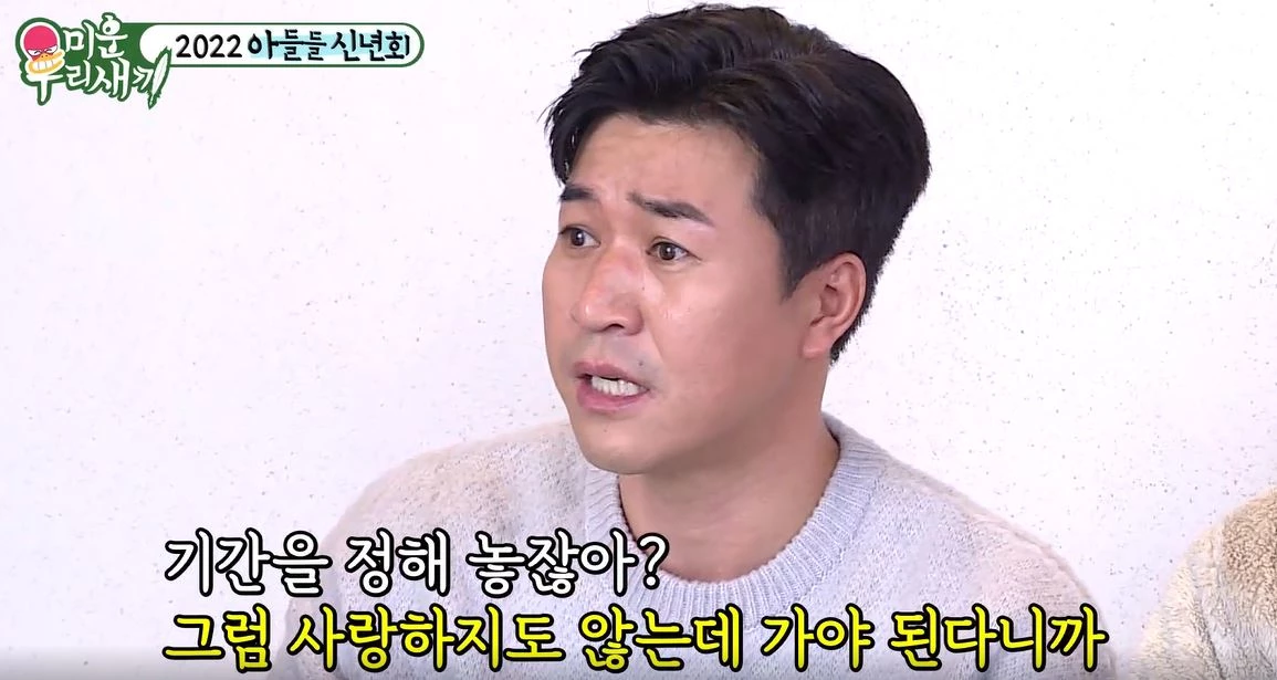 김희철은 "나는 그렇게 계획을 하고 있다"고 단언했지만 다른 멤버들은 그게 가능하냐며 웅성거렸습니다. 김종민은 "안돼 안돼. 힘들다"며 "기간을 정해놓잖아? 그러면 사랑하지도 않는데 가야 한다"고 의견을 내놨스빈다. 이에 이상민은 "내가 기간을 정한 건데 내가 싫으면 기간을 다시 연장하면 된다"고 다른 방법을 제시해 웃음을 안겼습니다.